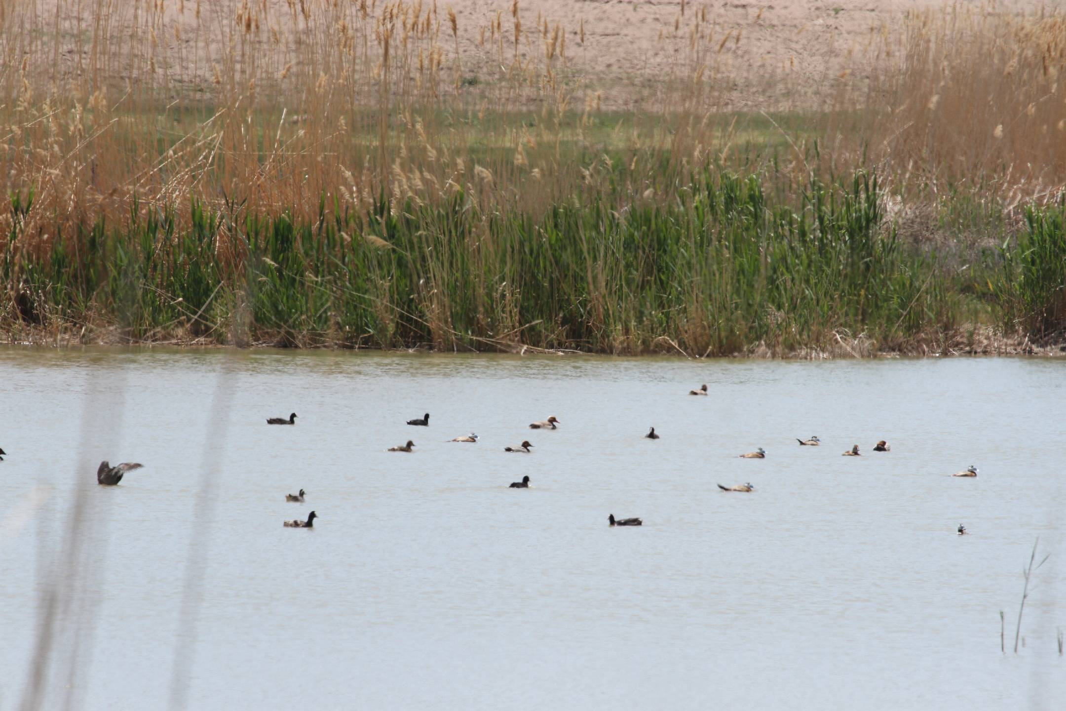 Phragmites australis (reed) populations can be seen along the northeastern shores of the lake.